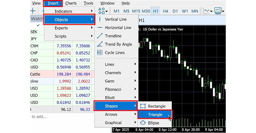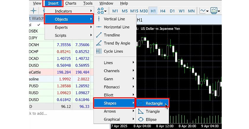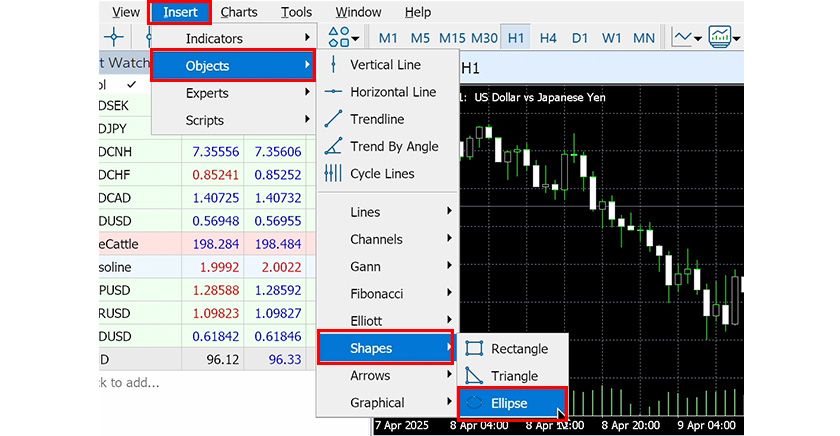 In MT5, you can freely draw rectangles, triangles, and ellipses on charts.