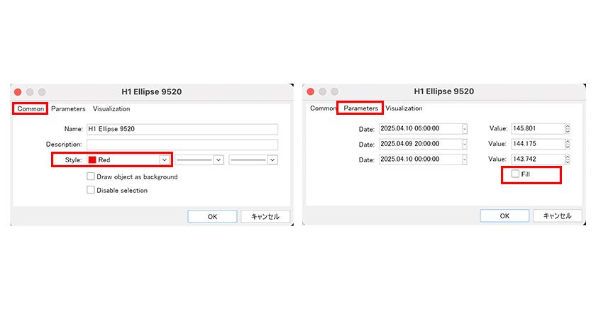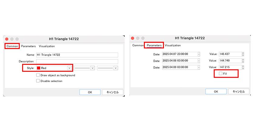 *To access the properties window of each object, right-click on the chart, select "Object List" from the menu, choose the desired object from the list, and click "Properties." Alternatively, right-click on the selected object's points (small squares) and choose "Properties" from the displayed menu.