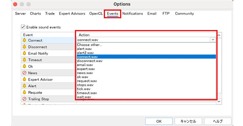 In the displayed options window, select the "Events" tab. A list of events will appear. Double-click the "Action" column of the event you want to change, select the desired sound from the dropdown menu, and click OK.