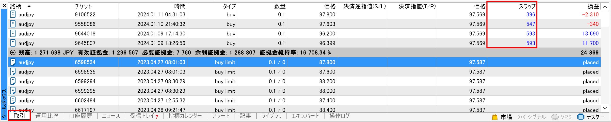 The swap points for open positions are displayed in the "Swap" column within the "Trade" tab of the toolbox.