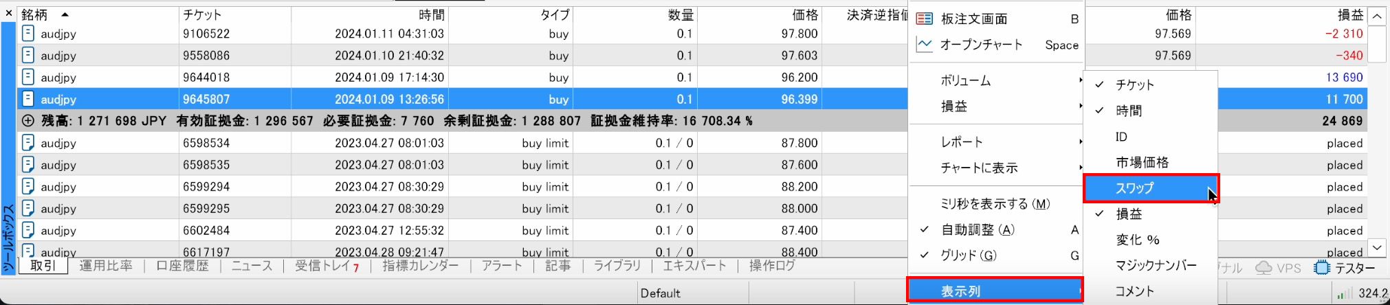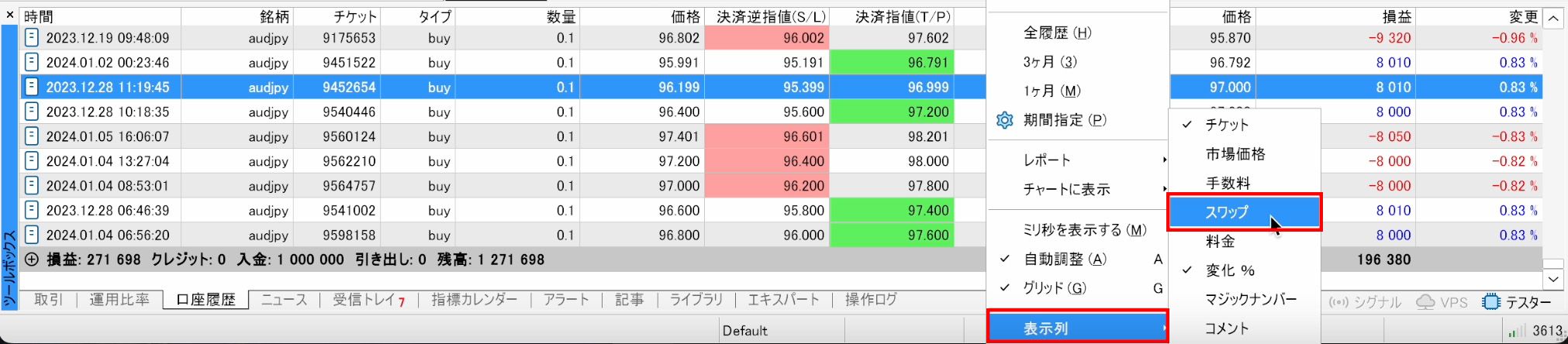 As with the Trade tab, if the "Swap" column is not visible, right-click within the "Account History" tab and select "Swap" from the "Columns" menu to display it.