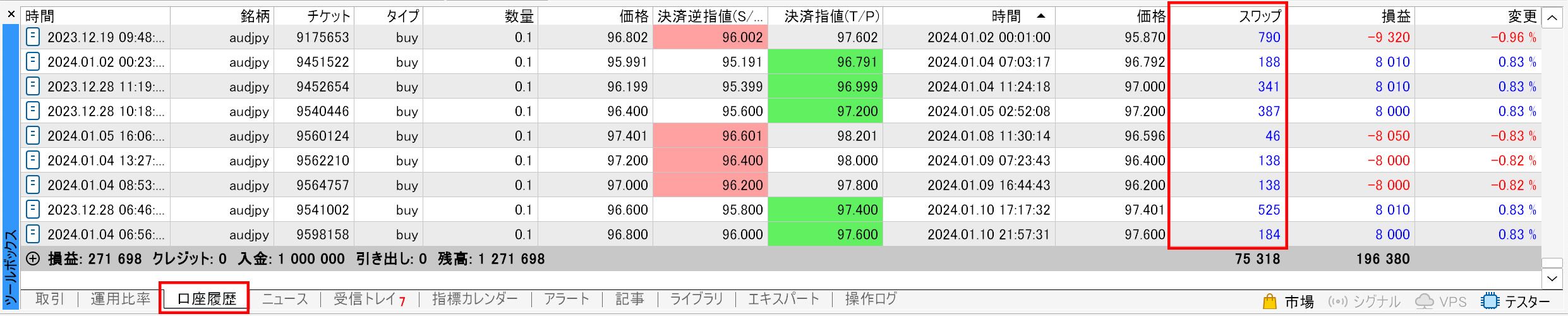 The swap points for closed positions are displayed in the "Swap" column within the "Account History" tab of the toolbox.