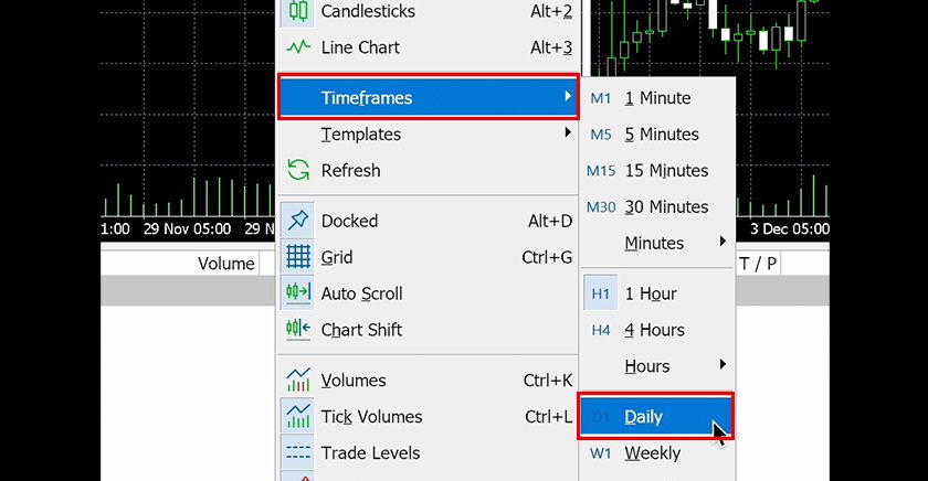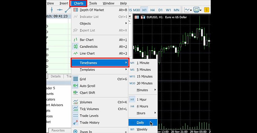 You can switch the time frame by selecting the desired time frame from 'Time Frame Settings' under the 'Chart' menu in MT5.