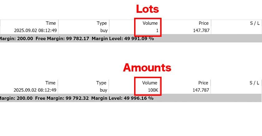 The trade volume display in the "Trade" tab of MT5's Toolbox can be switched between lots (for FX, 1 lot = 100,000 currency units) and monetary values (for FX, the number of currency units).