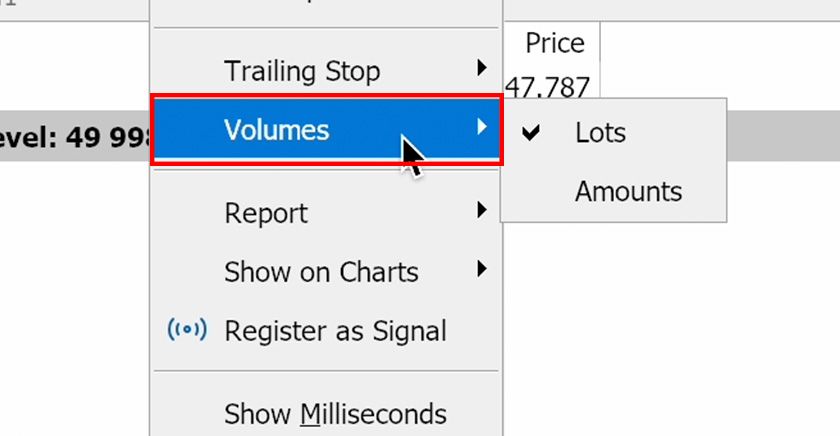 Right-click within the "Trade" tab of the Toolbox, and from the menu, select "Volume" and then choose either "Quantity (Lots)" or "Monetary."