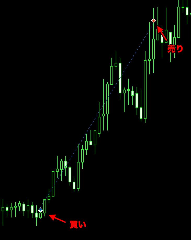When trade history display is enabled, entry and exit levels are indicated by arrows, and the holding period is shown with blue dotted lines.
