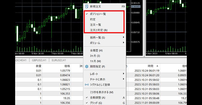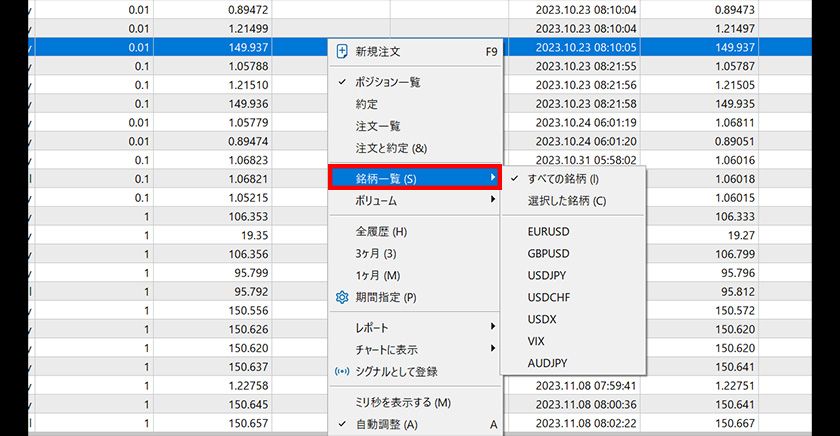 To specify the period displayed in the account history, right-click in the "Account History" tab and select "All History", "Last 3 Months", "Last Month", or "Custom Period" from the menu.