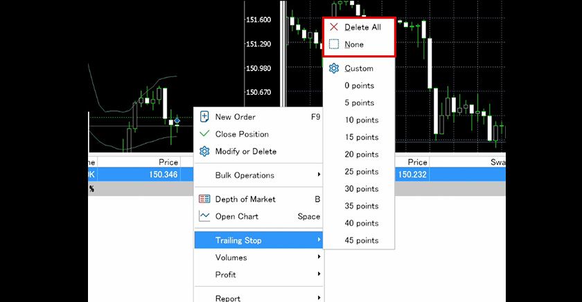 To end a trailing stop, right-click on the position row and select 'None' to remove the trailing stop from the selected position, or 'Delete All' to remove trailing stops set on all positions.