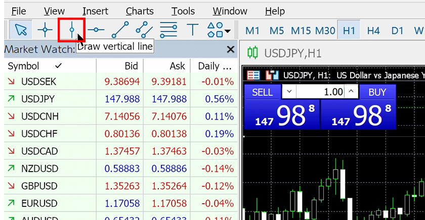 To draw a vertical line, switch the cursor to vertical line mode. There are two ways to do this: