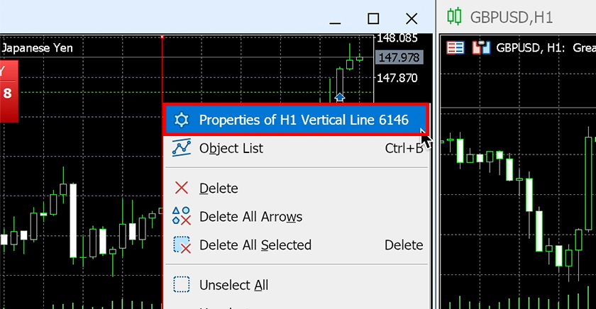 Right-click on the selected vertical line and choose "Properties Timeframe Vertical Line Number" from the menu to open the properties window.