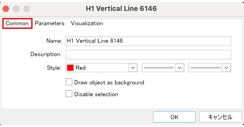 The "Common" tab allows you to specify the line's name, description, color, thickness, and type.