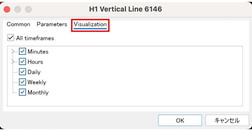 The "Visualization" tab allows you to specify the timeframes in which the vertical line is displayed. Uncheck "Show on all timeframes" to display the line only on selected timeframes.