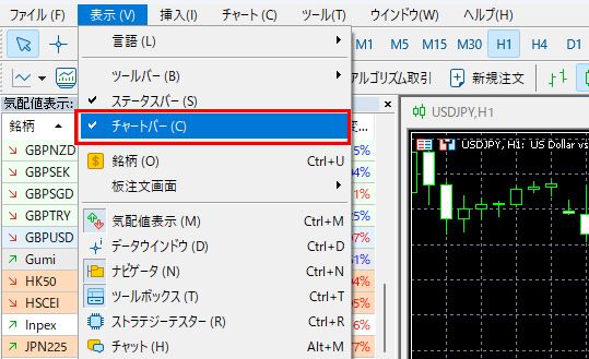 From the "View" menu, select "Chart Bar" to toggle the display of the chart bar. While displayed, a checkmark will appear to the left of the checkbox label.