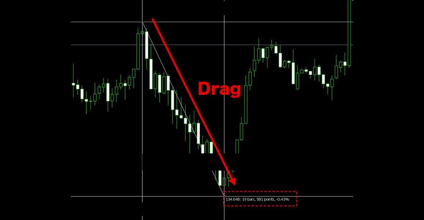 Holding and dragging in crosshair mode on the chart shows the number of bars, the number of points, and the ending price from the start point to the end point.
