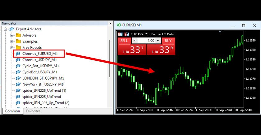 The EA operates on a selected chart. Set the trading symbol and time frame, and double-click on the EA name in the navigator or drag and drop it onto the chart.