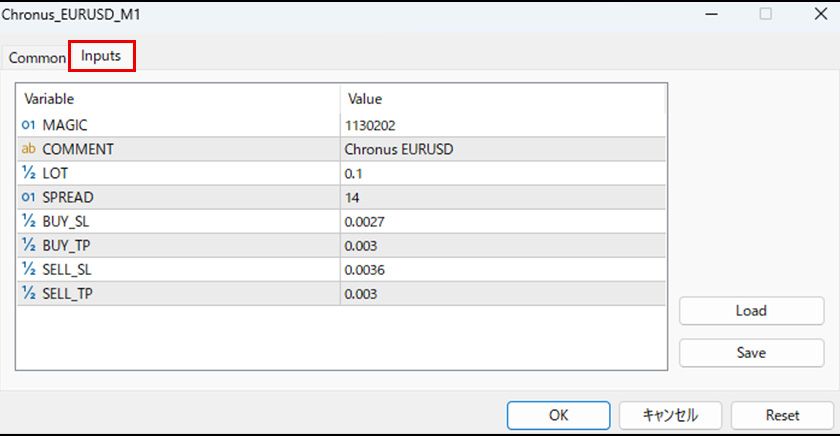 In the 'Inputs' tab, set parameters like lot size as needed and click 'OK' to launch the EA.