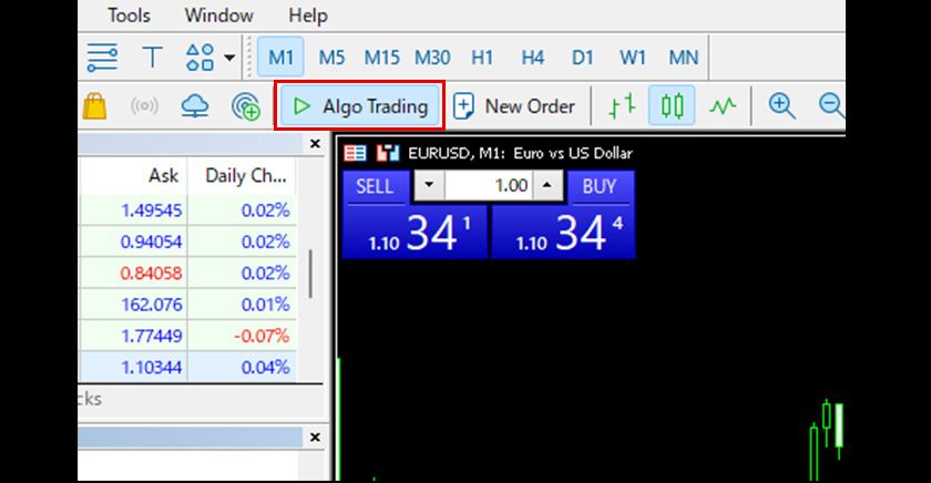 Finally, click the 'Algo Trading' section of the toolbar to turn automated trading on (green play icon), starting the automated trading process.