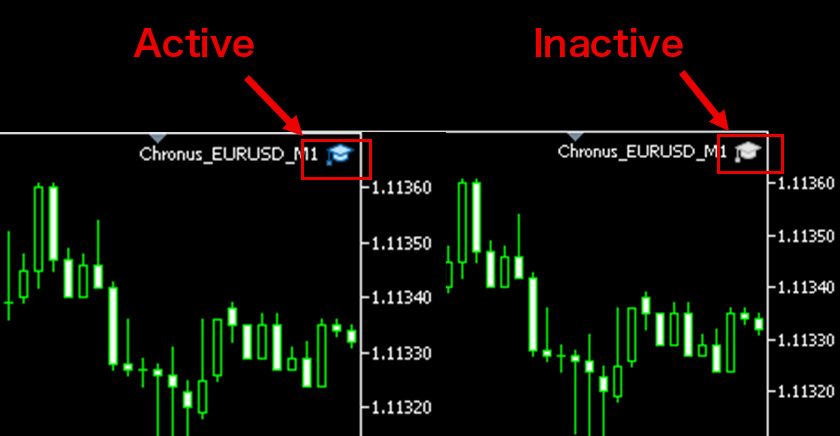 You can verify that the EA is operating by the hat icon at the top left of the chart. A blue hat icon indicates that the EA is active, and a white hat icon indicates it is stopped.