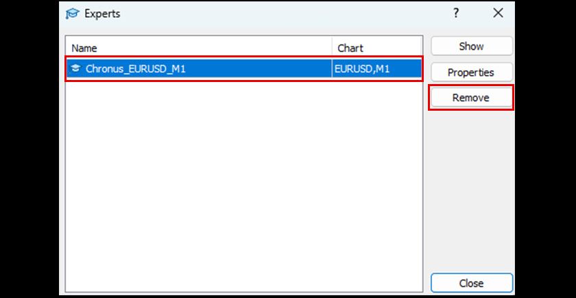 Select the EA you wish to stop and click the 'Remove' button. Closing the chart where the EA is running will also stop it. Note that open positions or pending orders remain, so if they are not needed, they should be closed manually.