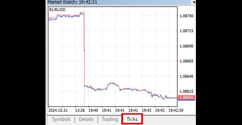Displays the tick chart for a selected single symbol. Used when you want to check the most recent minute price movements.