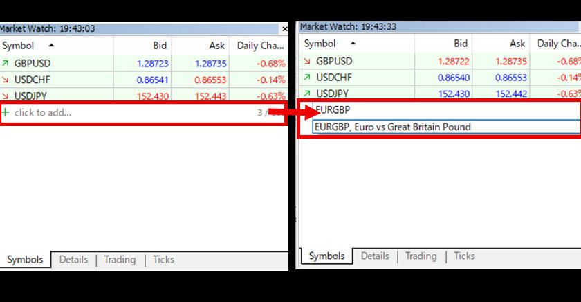 Click on "Click to add" at the bottom of the displayed symbols, and you can add by entering the symbol name in the input field that appears.