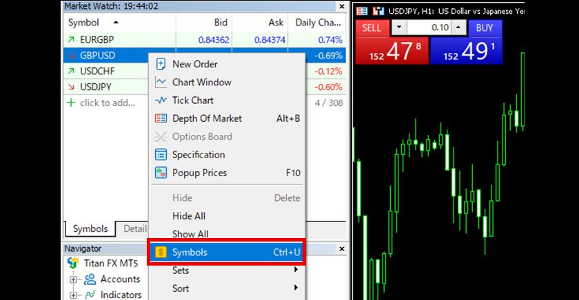 Right-click on the Market Watch and select "Symbols" from the menu that appears.