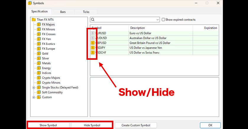 Symbols displayed in the Market Watch can be added or deleted as needed. It's advisable to hide unnecessary symbols to reduce the load on your PC. Adjust according to your needs.