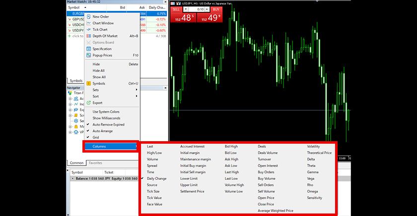 To adjust, right-click on the Market Watch and check the items you want to display in the display column.