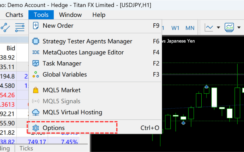 Select ‘Options’ from the ‘Tools’ menu in MT5.