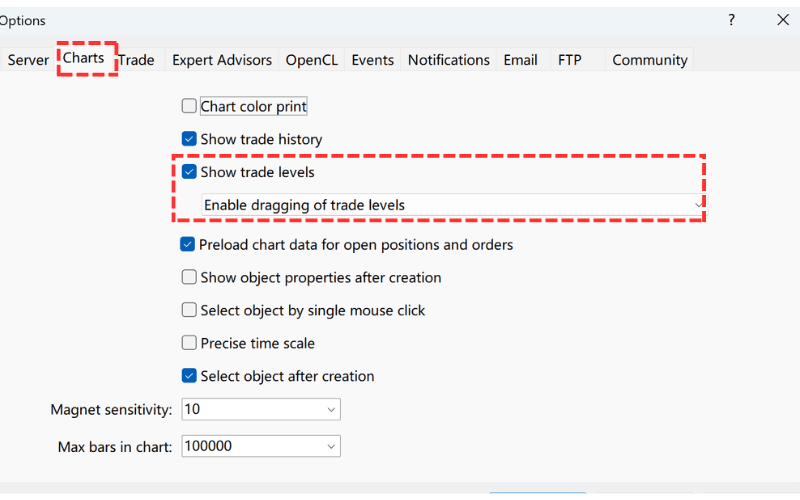 In the 'Charts' tab of the displayed options window, check 'Show trade levels' and ensure that the dropdown below enable dragging of trade levels.