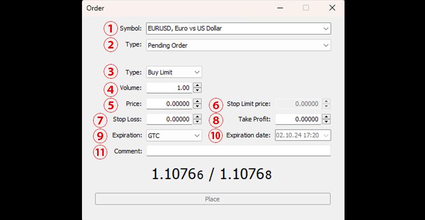 ③ Type (lower): Choose from Buy Limit, Sell Limit, Buy Stop, Sell Stop, Buy Stop Limit, Sell Stop Limit.