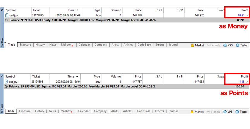 Selecting "As Money" displays the exact profit and loss amount, while "As Points" displays the profit and loss in points.