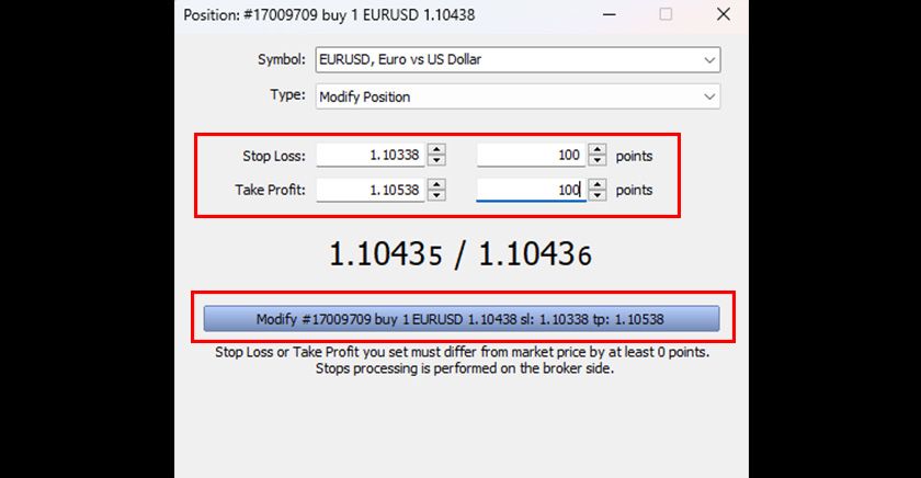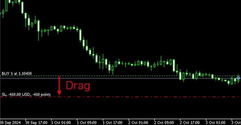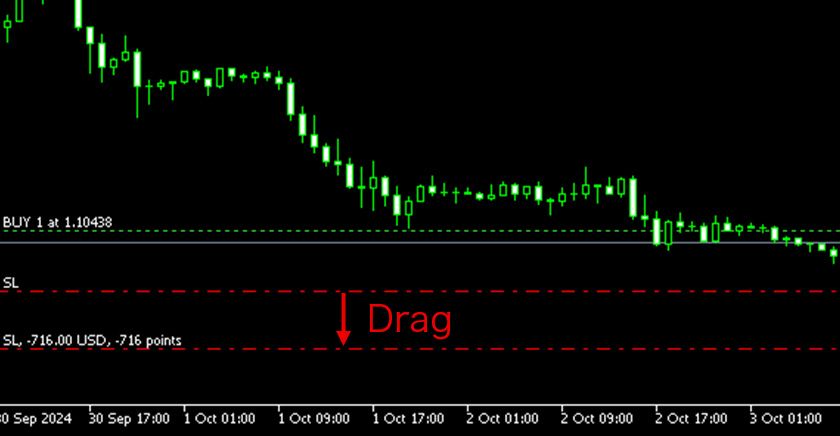 Drag from the line representing the position to the desired level to add or modify a Take Profit or Stop Loss. If One-Click Trading is enabled, changes occur immediately; if it is disabled, an order screen will appear, and you can confirm the changes and click 'Modify' to complete them.