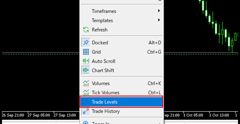 Toggle the display of positions and orders on the chart by right-clicking on the chart and selecting 'Trade Levels' from the menu that appears.