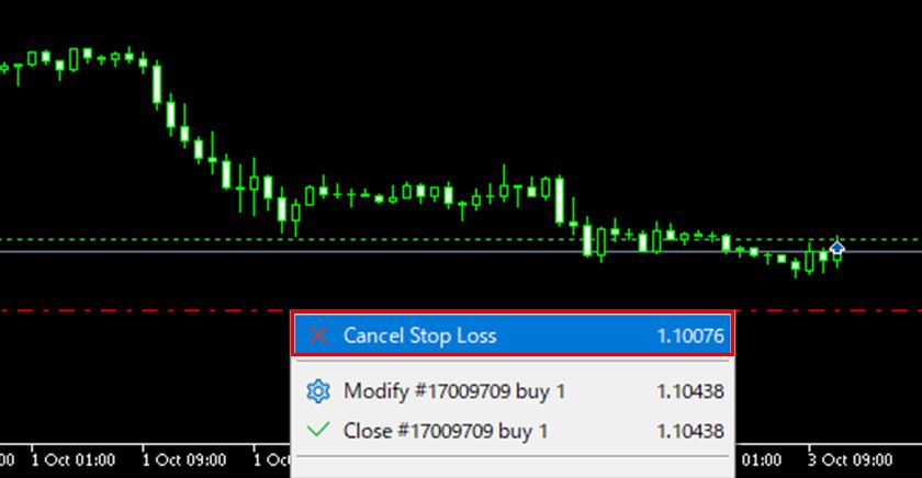 If you wish to cancel an already placed closing order, right-click on the line representing the closing order on the chart and select 'Cancel Stop Loss (or Take Profit)'.