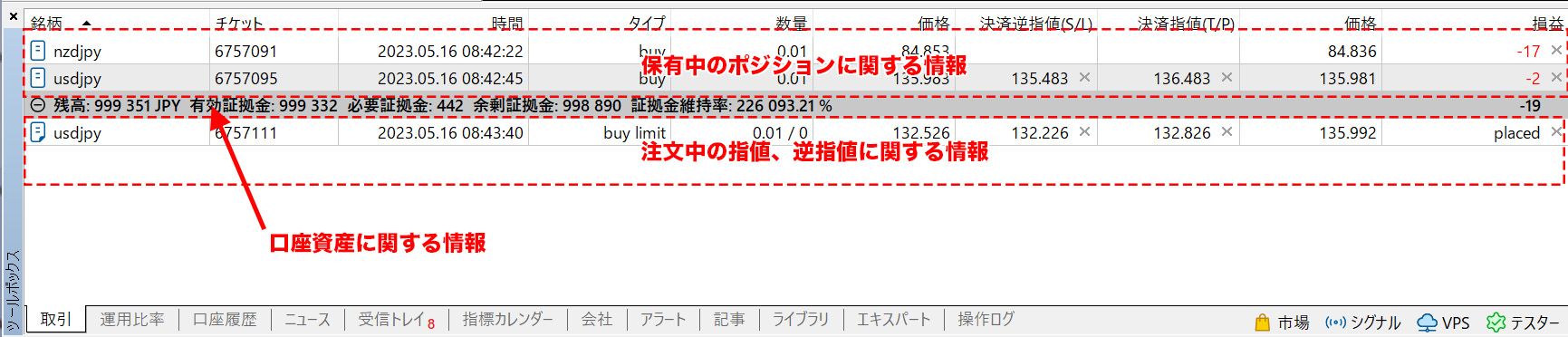 In MT5's 'Trade' tab within the Toolbox, you can view information about your current holdings, details of pending limit and stop orders, and information about your account's current assets.