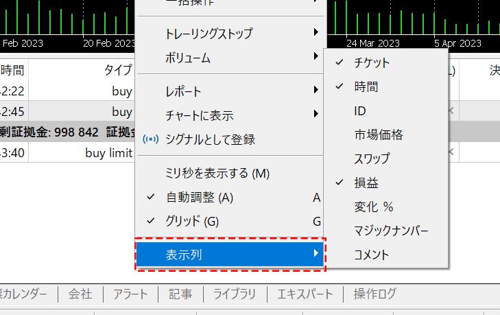 To change the settings, right-click in the 'Trade' tab, select 'Columns' from the menu that appears, choose the details you want to display, and check them.