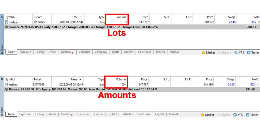 In the "Trade" tab of the MT5 Toolbox, you can choose to display trade volume either in lots (for FX, 1 lot = 100,000 units of currency) or in amounts (for FX, the number of currency units).