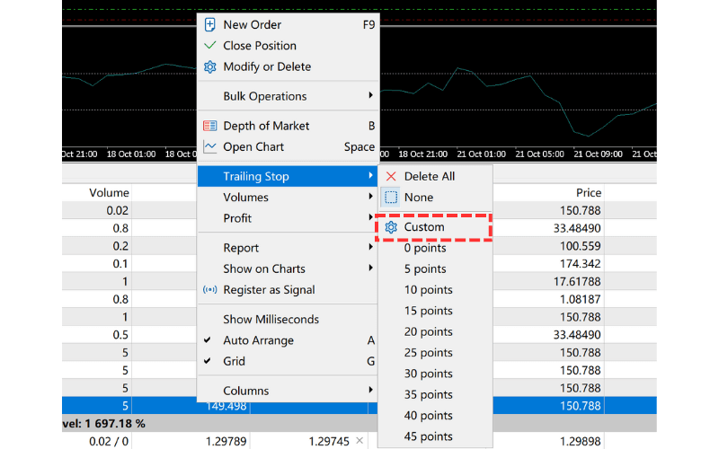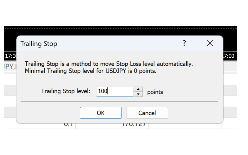 ・The trailing stop function only works when MT5 is running; it will not continue to trail if MT5 is closed. Also, be aware that the mobile version does not support the trailing stop function.