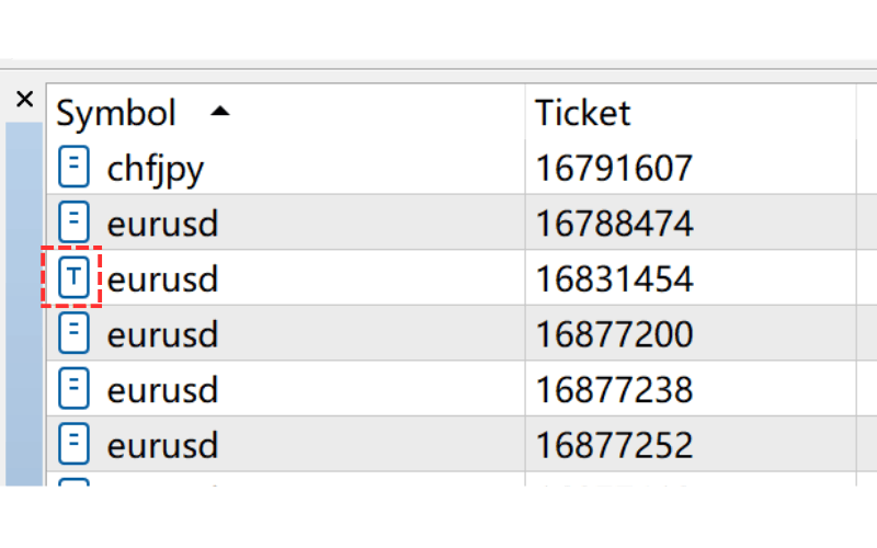 When a trailing stop is set, a 'T' icon appears on the left side of the position in the 'Trade' tab of the terminal.