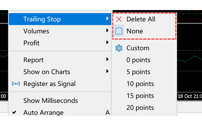 To end a trailing stop, right-click on the position row and select 'None' to remove the trailing stop from the selected position, and 'Delete All' to remove trailing stops from all positions.
