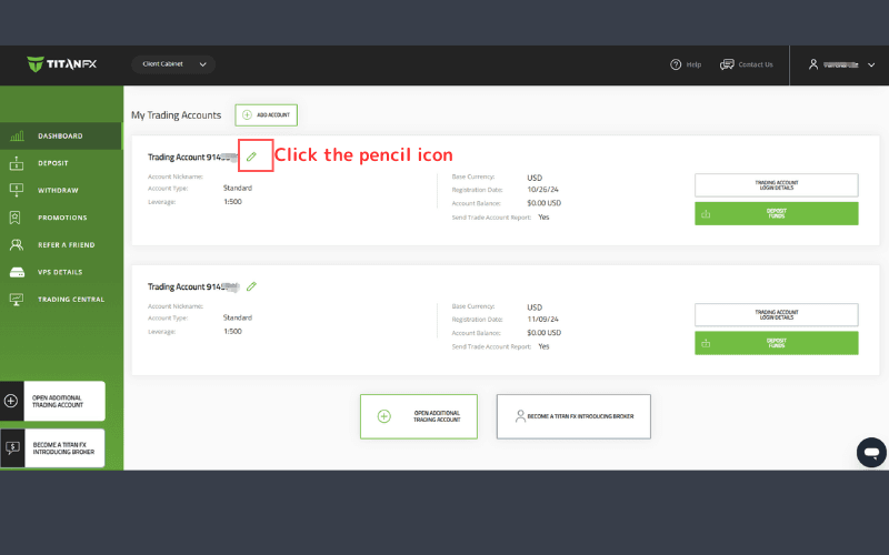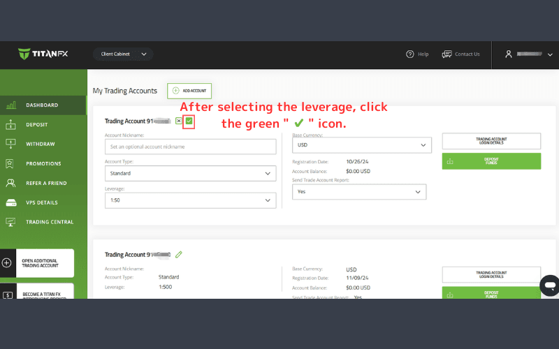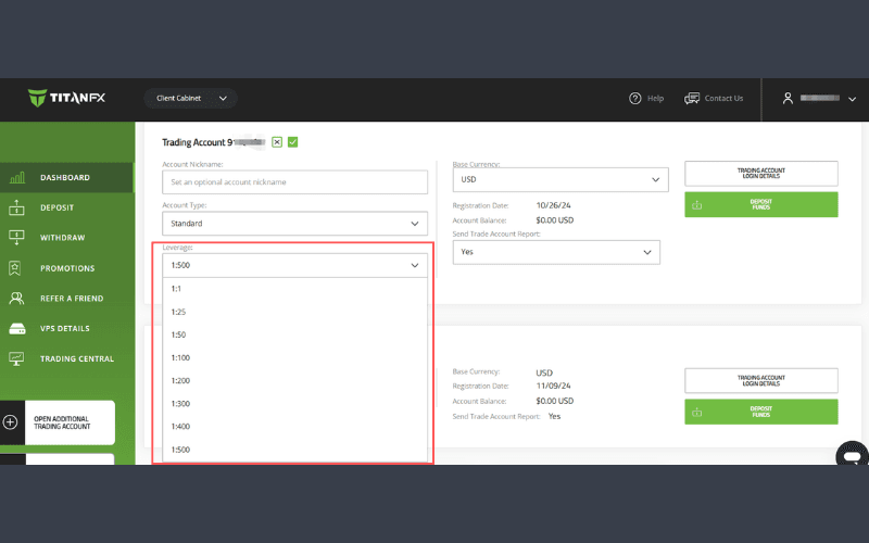 On the Titan FX Client Dashboard, you can directly adjust your leverage settings.