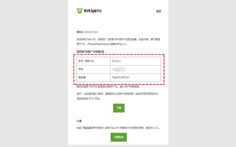 At this point, you will receive an email with the subject 【Titan FX: Your MT4/MT5 Account is Ready!】, containing the following details: