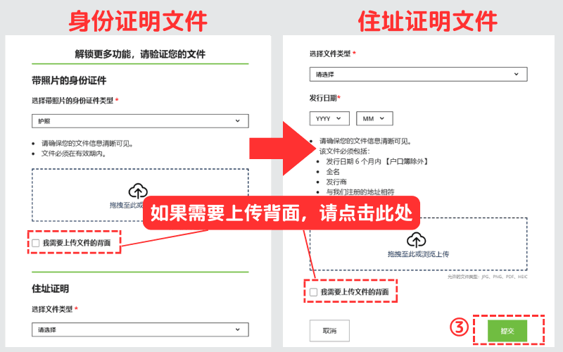 For users in mainland China, you need to submit identity verification and address proof: One document from each category is sufficient for verification.