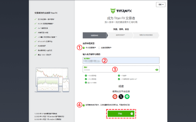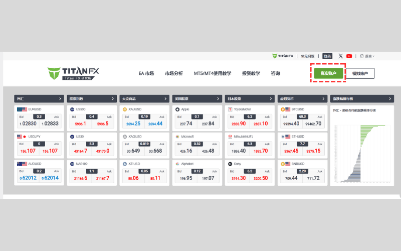 Open your browser and visit the official Titan FX Chinese registration page. Click the Real Account button.
