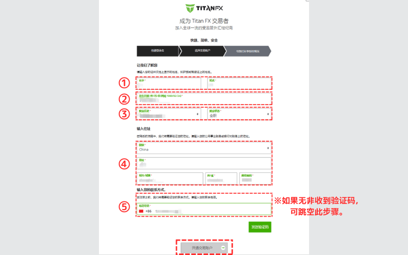 Fill in your personal information as prompted on the page, and complete the SMS verification. Then click "Open Trading Account" to finish the process.