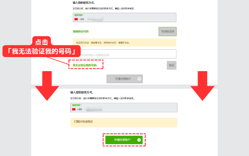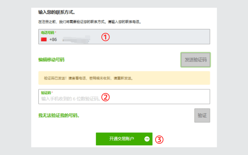If you do not receive the verification code, click "I cannot verify my number" at the bottom left, then click "Open Trading Account" to continue with the next steps.