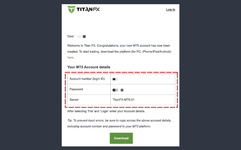 You will also receive an email with the subject [MT4/MT5 Account Now Available!], including your login credentials, initial password (modifiable), and server details. If not received, check your spam folder or log in to the client portal to view details and set a memorable password.