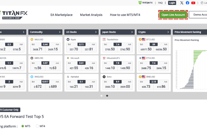 Open your browser, go to the Titan FX official registration page, and click the 「Open Live Account」 button.
