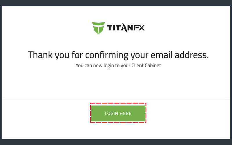 After verification, you will see a success page and can click "LOGIN HERE" to access the client portal.